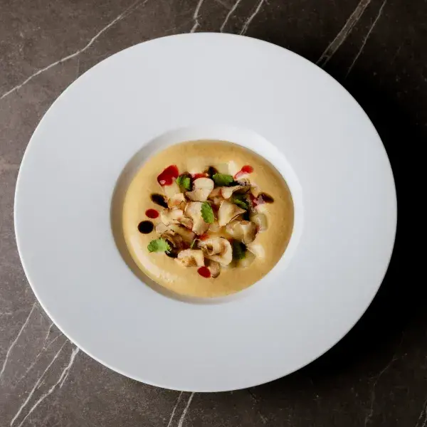 Ravioli di coniglio arrosto, doppia panna allo zafferano, carota e zenzero