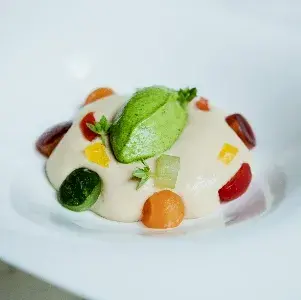 Zuppetta tropicale, ganache al cioccolato bianco e ananas e gelato allo yogurt